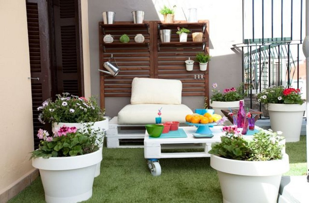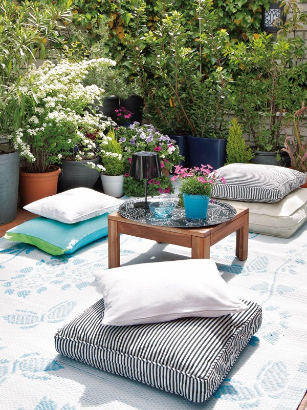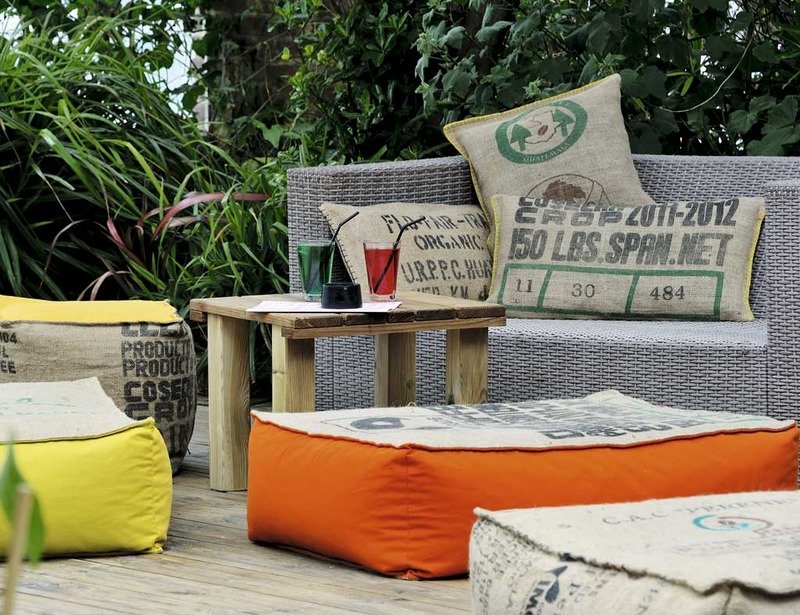 Los colores llamativos, las flores y grandes macetas, los muebles reciclados o fabricados con materiales ecológicos, los cómodos cojines que acompañan a los sofás de madera natural y las canastas de mimbre son característicos de la decoración de terrazas y jardines